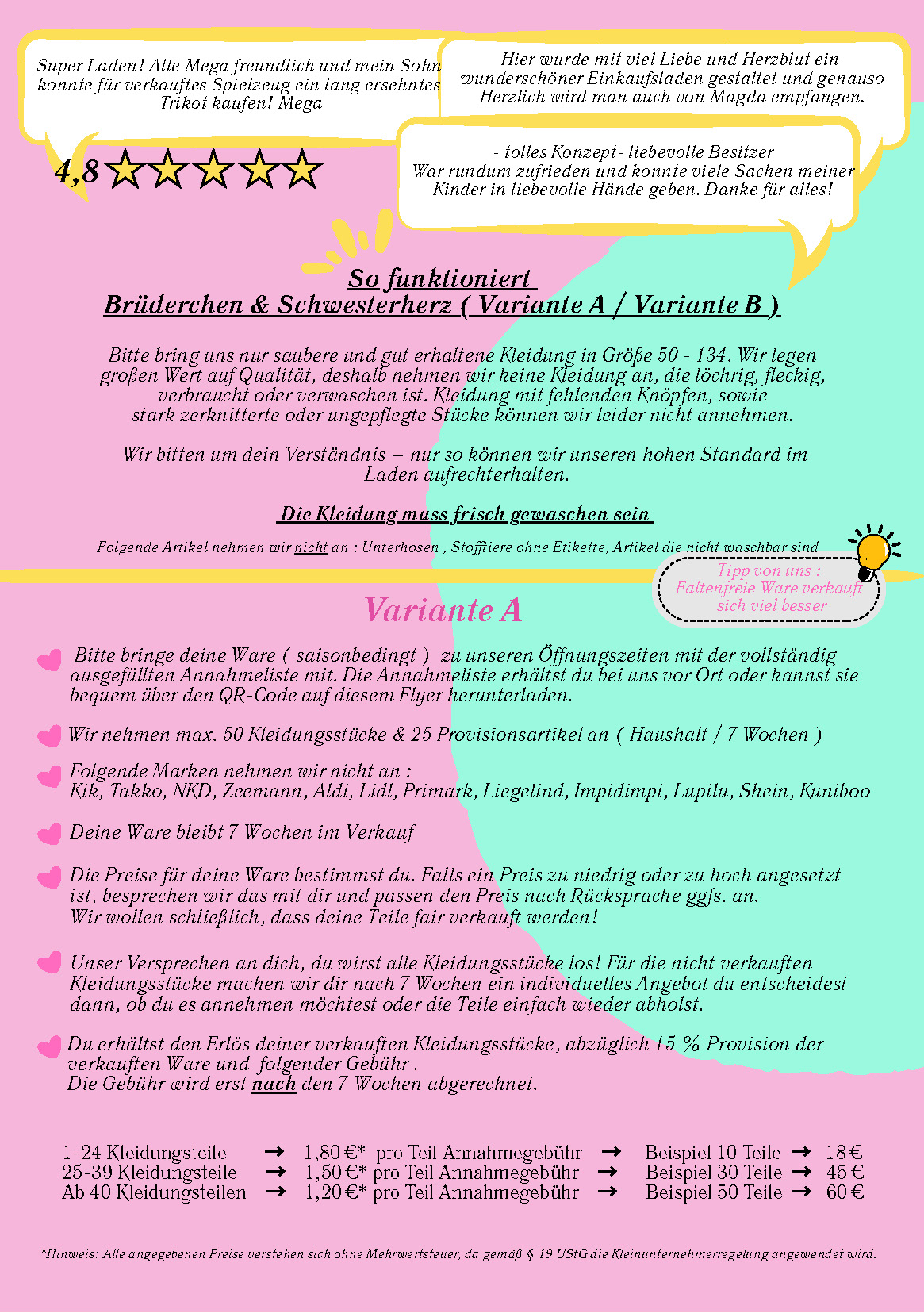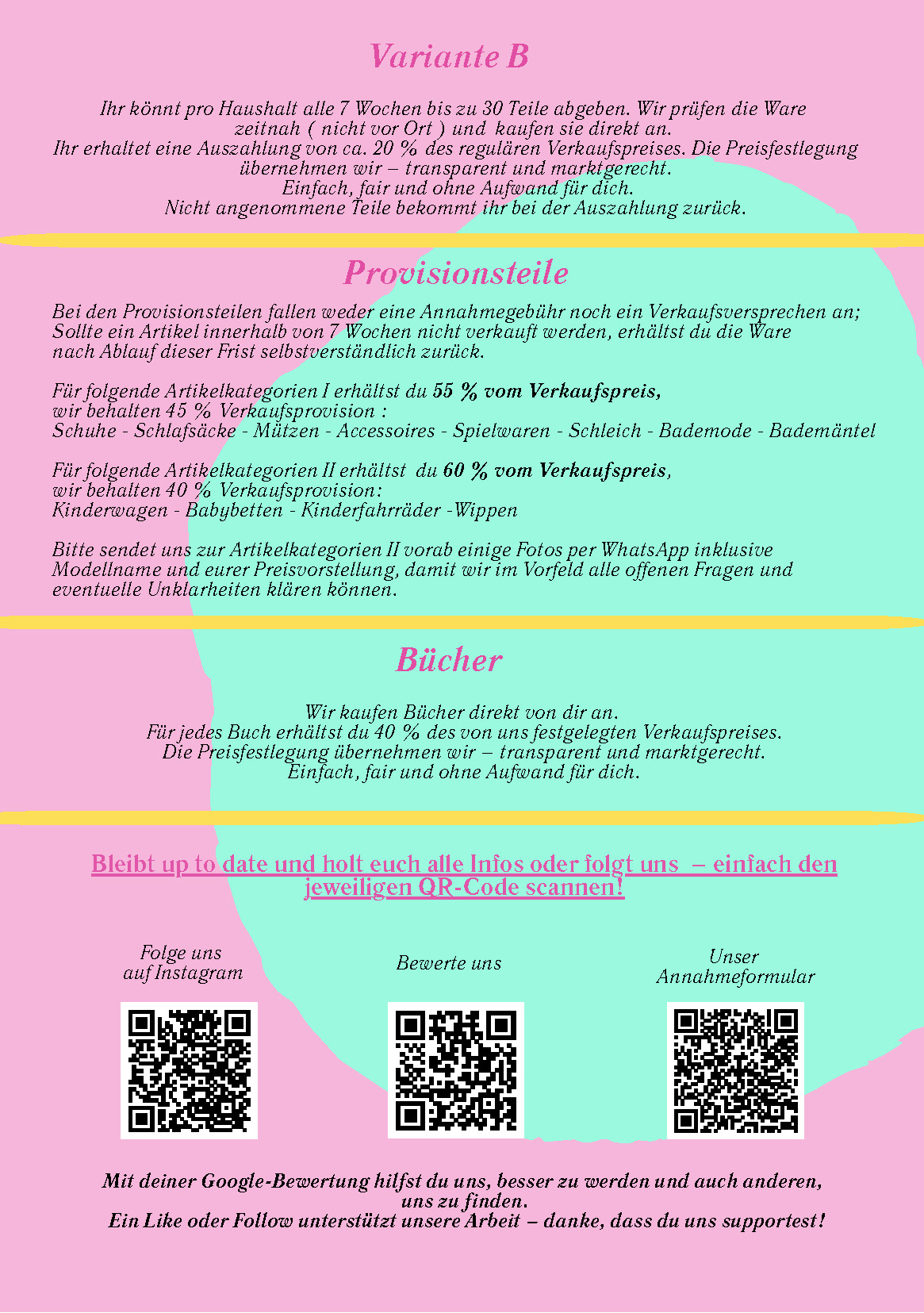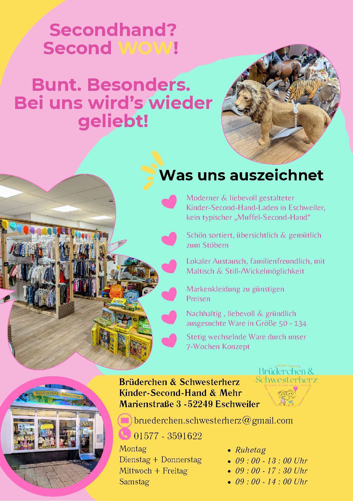 Mit unserem Second-Hand-Konzept möchten wir bewusst eine lokale Alternative zu großen Online-Plattformen bieten. Kleidung bleibt in der Region, Familien unterstützen sich gegenseitig und der lokale Handel wird gestärkt. So entsteht ein Kreislauf, der sinnvoll ist – für Menschen, für Kinder und für die Stadt.